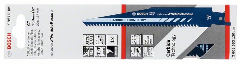 S 957 CHM Endurance for Vehicle Rescue, üstün bıçak kullanım ömrüyle otomotiv çeliklerinde güçlü kesimler sunar. Karbür dişler, kurtarma ve araba parçalama uygulamalarında yıkım kesimlerinde en yüksek dayanıklılığı sağlar. Ayrıca bıçağın kalın malzemesi (1,35 mm) metal yıkımı için mükemmel stabilite sağlarken konik gövdesi ve kabartma taşlanmış ilk dişi ise daldırmalı kesim olanağı sunar. Bu bıçağın dişleri, Karpit Teknolojisi kullanılarak elastikliği yüksek bir çelik gövdeye kaynaklanmıştır ve en zorlu materyallerle dahi kullanılabilir. Orta seviye diş aralığı (3 mm) A / B / C araç sütunlarının kesimi için idealdir. Standart uzunluğu (150 mm) 100 mm derinliğe kadar kesim yapar ve ön cam, tavan ve üçüncü kapı kesimleri için idealdir. 1/2 inç üniversal şaftlı sistemlerin olduğu panter testereler ile kullanım için.